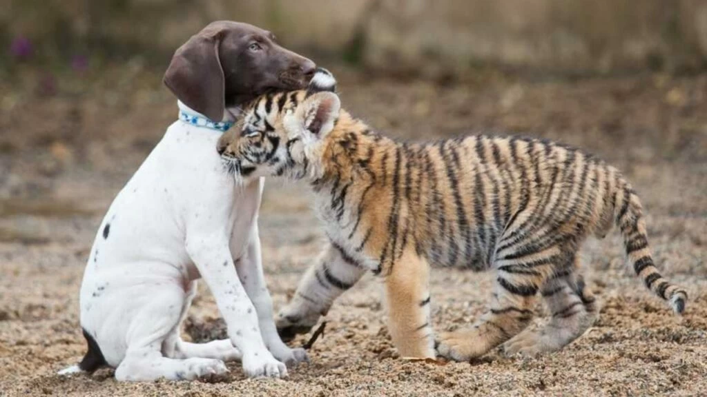 Cucciolo di tigre rifiutato dalla madre forma un legame inscindibile con un cagnolino in un santuario sudafricano.