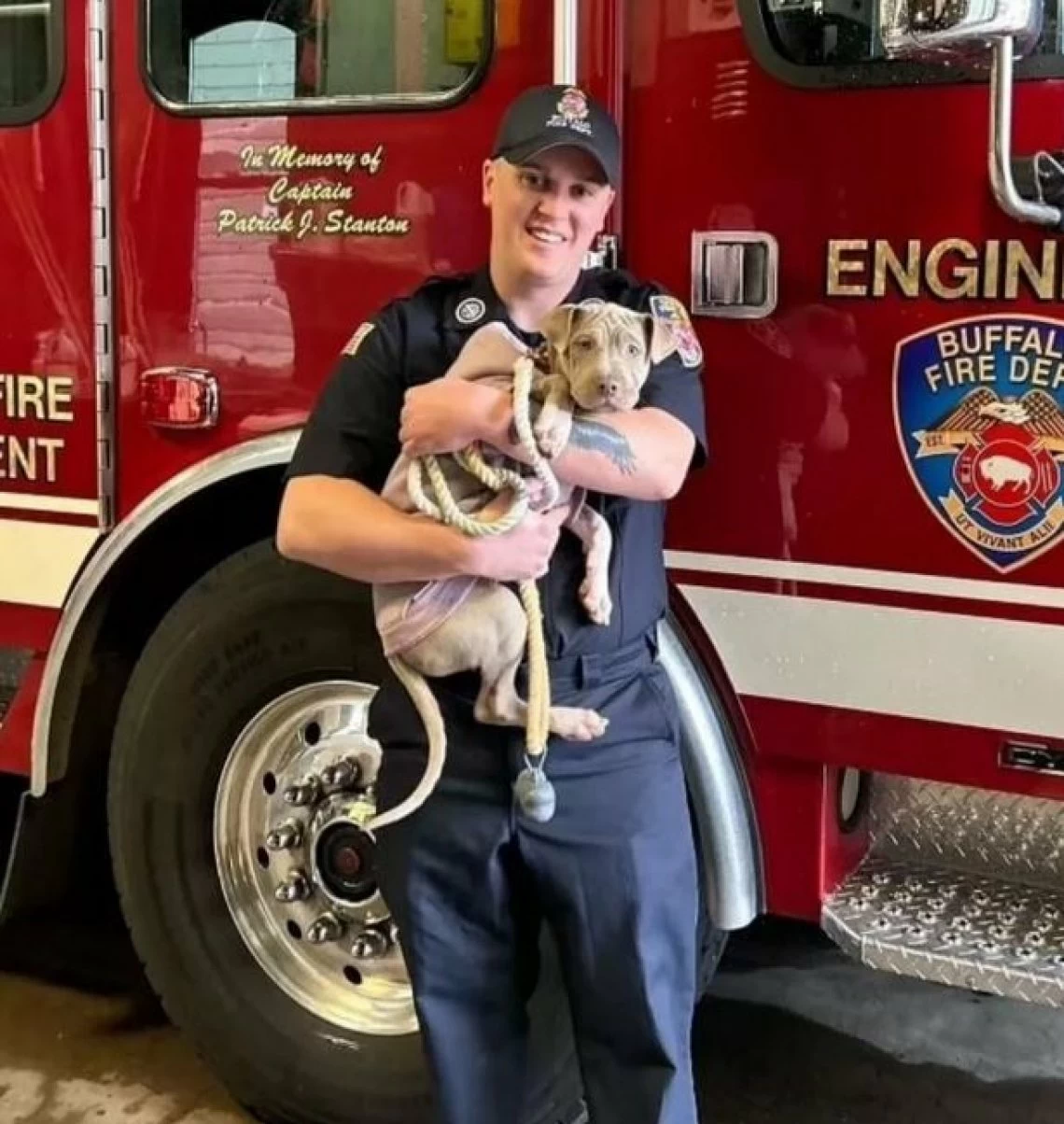 Due giovani ragazze portano un cane ferito alla stazione dei pompieri di Buffalo, New York, dove viene salvato e adottato dal pompiere Anthony Pulvino.