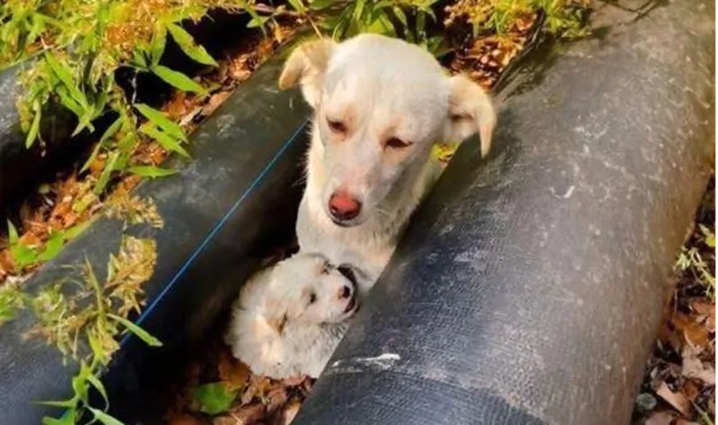 Durante una passeggiata lungo un sentiero immerso nel bosco, non lontano da un’abitazione isolata, un passante è stato attirato da un lieve fruscio. Avvicinandosi con cautela, ha fatto una scoperta che ha toccato profondamente il suo cuore: tra due tubi arrugginiti, rannicchiati l’uno accanto all’altra, si trovavano una cagna adulta e il suo cucciolo.