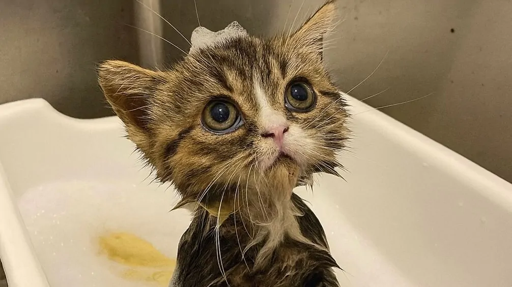 Tra stupore e diffidenza, ha affrontato il suo primo bagnetto: bolle, coccole e uno sguardo che dice tutto. Ora profuma di nuovo inizio.