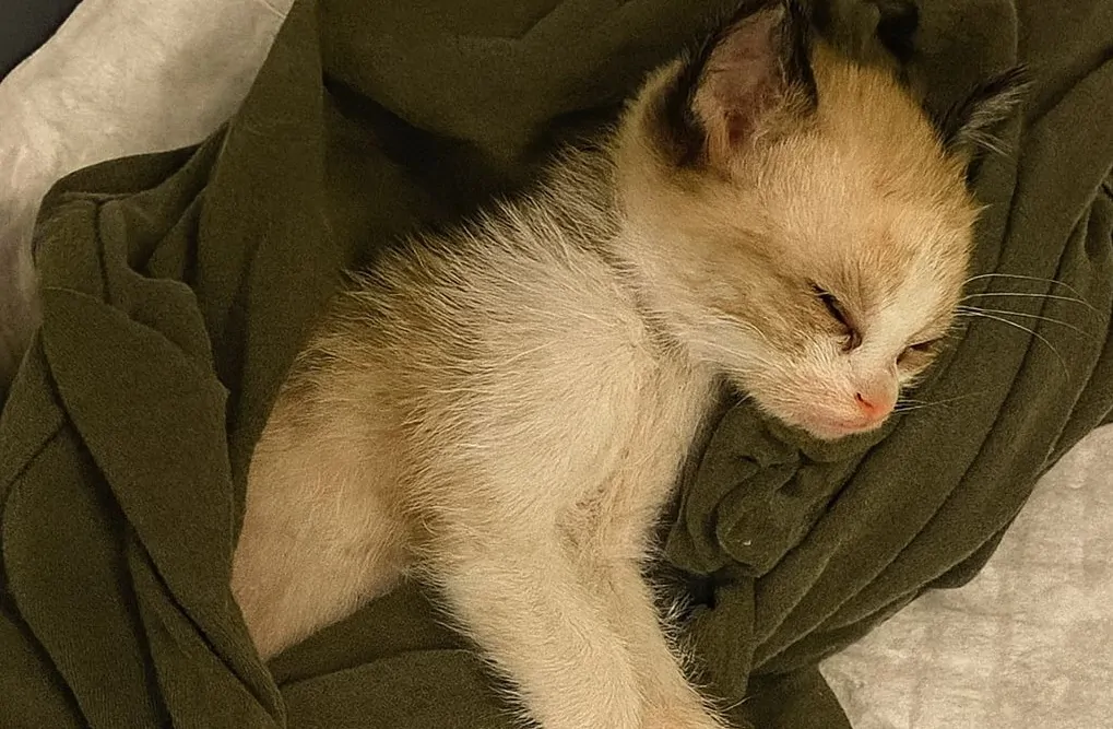 Era quasi mezzanotte quando un piccolo fagotto di pelo fu trovato dentro una scatola, davanti a una clinica chiusa. Il gattino tremava nonostante fosse avvolto in un vecchio pezzo di stoffa. Il respiro era lento e irregolare, i suoi occhi socchiusi sembravano raccontare una sofferenza troppo grande per una creatura tanto fragile. Accanto a lui un biglietto scritto a mano: «Per favore salvatela. Non posso più prendermi cura di lei».