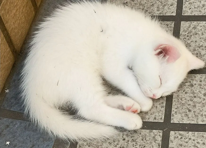 Trovata immobile vicino a un muro di pietra, una gattina bianca di pochi mesi viene accolta con amore nell’ultimo istante: un addio che diventa promessa di memoria.