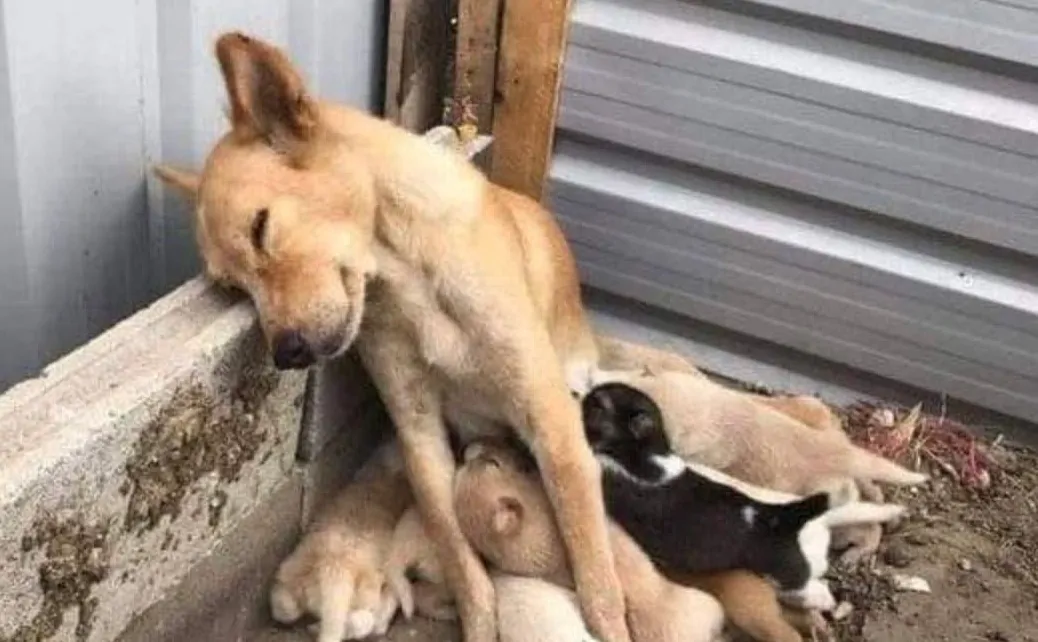 Appoggiata a un’asse traballante, il corpo ormai privo di forze, una cagnolina randagia si addormenta circondata dai suoi cuccioli affamati. Li stringe a sé, offrendo quel poco che le resta: un respiro, un po’ di calore, qualche goccia di latte. Non è la quiete del sonno, ma l’esaurimento di una madre lasciata sola, costretta a resistere con ciò che non ha più.