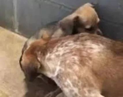 Quando i volontari del rifugio hanno visto la loro cuccia, si sono trovati davanti a una scena straziante. Sadie tremava, con lo sguardo perso, mentre cercava di proteggere il suo cucciolo nascondendolo dietro di sé. La piccola Benzy, impaurita, si rifugiava sotto la pancia della madre. Due anime legate dal terrore e dall’amore.