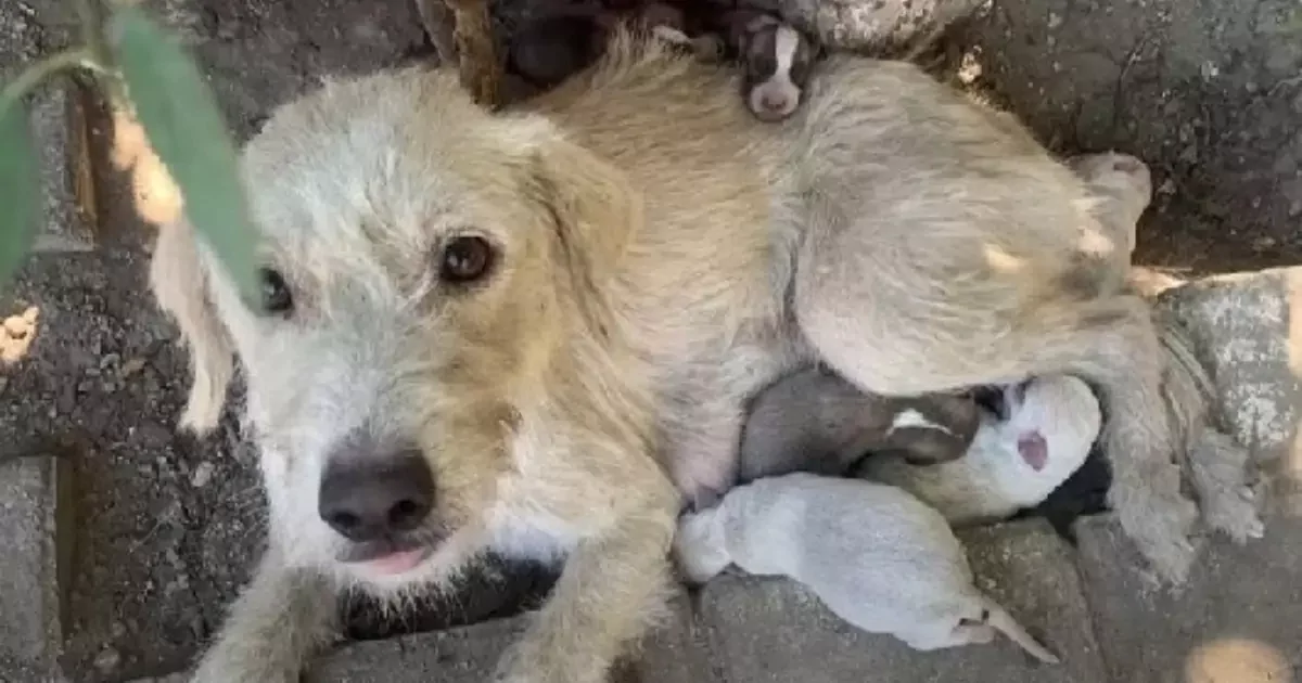 Era piena estate, le temperature erano altissime e il terreno bruciava sotto le zampe. Nonostante tutto, la futura mamma non si è arresa. Ha trovato un angolo in cui ripararsi e, con una forza incredibile, ha dato alla luce sette cuccioli, protetti solo dal suo corpo e dal suo amore.