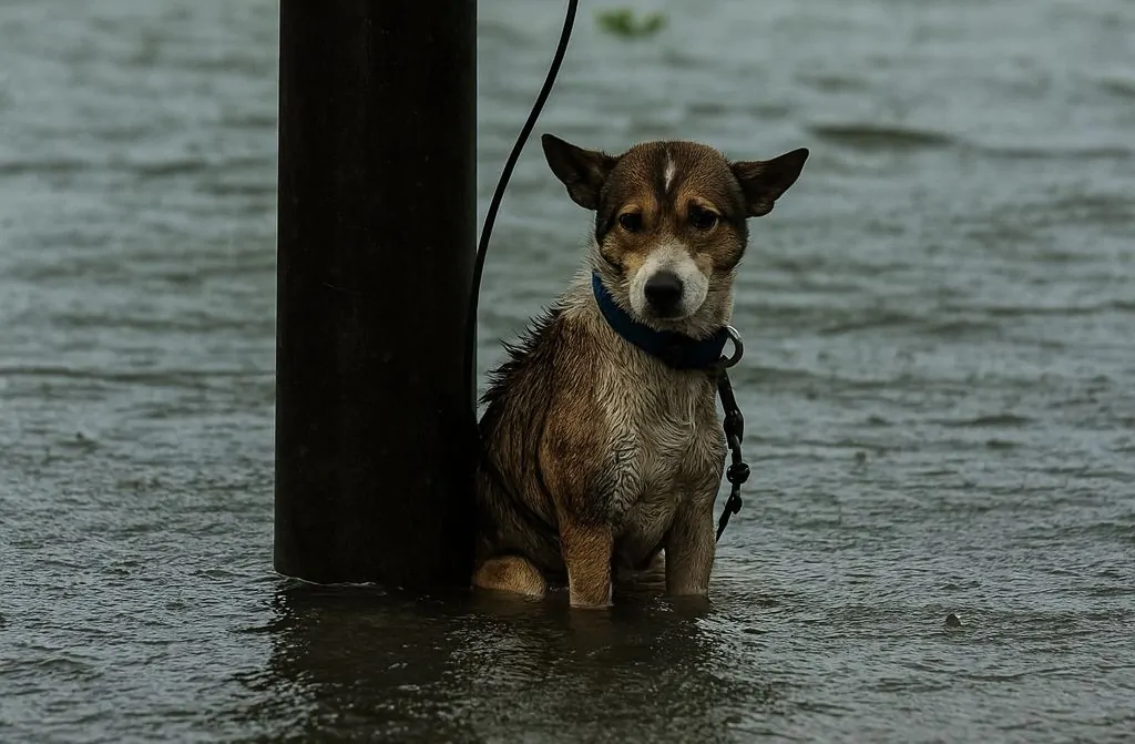 Quando l’uragano Harvey ha colpito il sud del Texas, le strade si sono trasformate in fiumi e centinaia di animali domestici sono rimasti intrappolati nell’acqua che continuava a salire. Tra loro c’era una cagnolina, poi chiamata Hope, trovata legata a un palo della luce dal fotografo del Daily Mail Ruaridh Connellan. L’animale era fradicio, immobile, con lo sguardo perso e senza la forza di cercare aiuto. La corrente avanzava rapidamente e il rischio che venisse travolta era concreto. Il fotografo, impegnato a documentare i danni della tempesta, ha raggiunto Hope attraversando l’acqua torbida e ha sciolto il nodo che la teneva bloccata. Subito dopo l’ha portata in un punto più sicuro, permettendole di allontanarsi dal pericolo imminente.