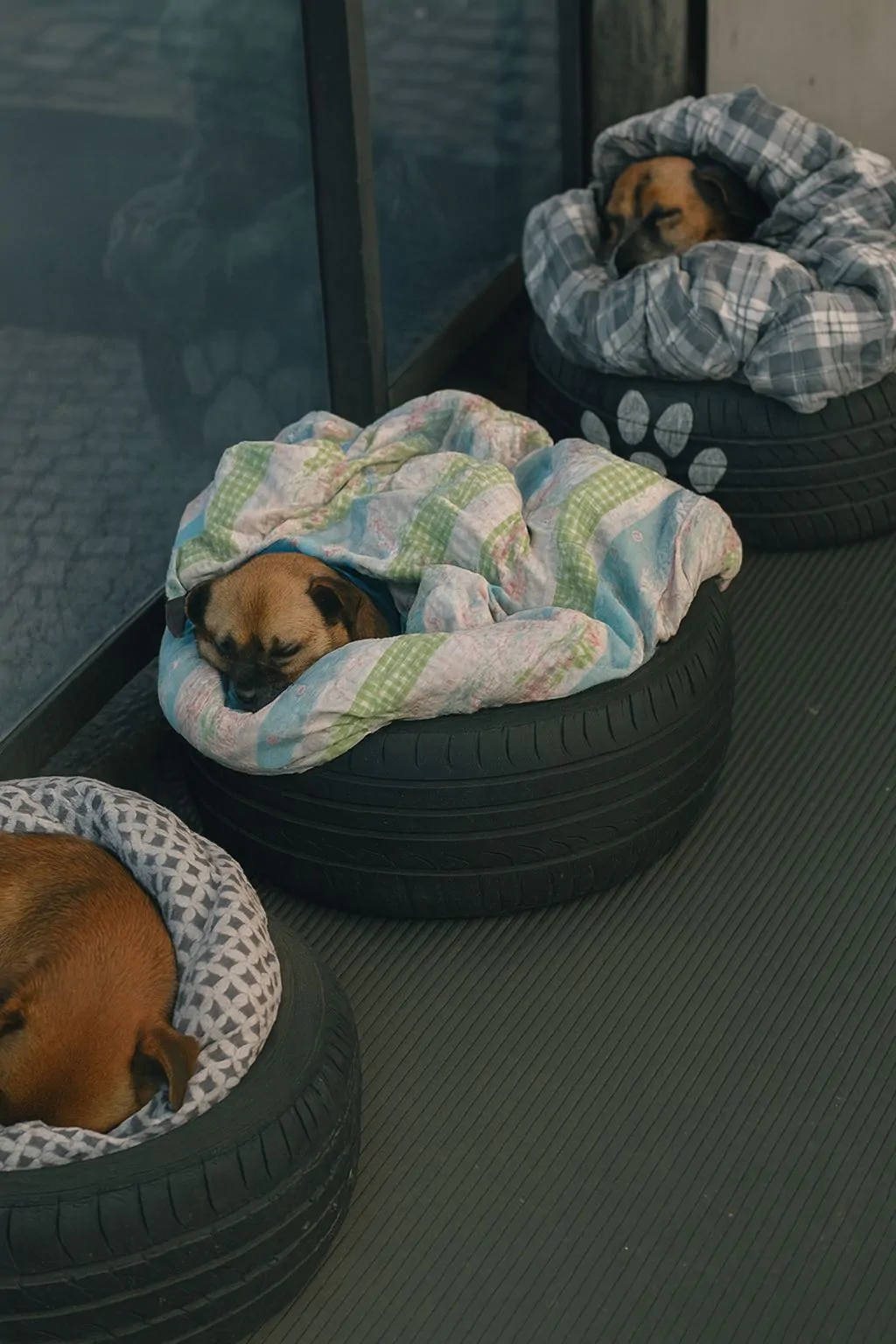 Una stazione degli autobus ha offerto riparo a cani randagi durante una notte gelida, trasformando vecchi pneumatici in lettini e dando origine a una mobilitazione solidale.