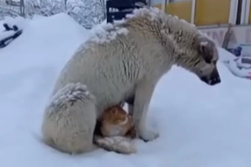 Il cane, invece di allontanarlo, lo ha accolto tra le sue zampe, offrendo riparo in mezzo alla neve che continuava a cadere fittamente sulla zona.