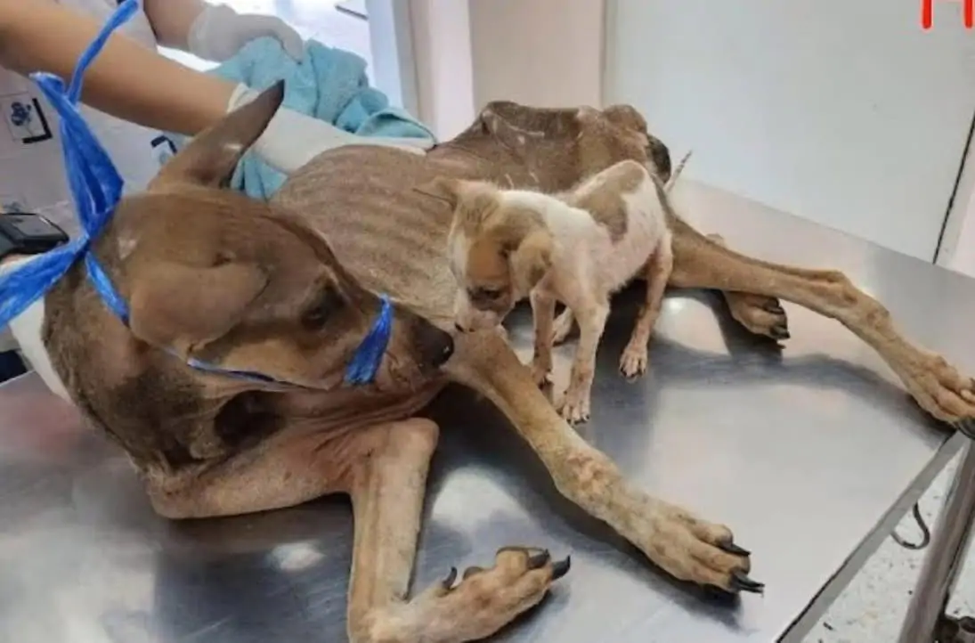 Camminava sul ciglio della strada spinta solo dall’istinto. Il corpo era ridotto all’osso, la pelle tesa sulle costole sporgenti, le zampe tremavano a ogni passo sotto un sole implacabile. Non cercava cibo per sé. Non cercava acqua. I suoi guaiti erano suppliche rivolte a ogni automobile che passava veloce, a ogni persona che tirava dritto senza fermarsi. Si allontanava di pochi metri, poi tornava indietro, si girava, indicava qualcosa tra l’erba alta e secca. Tra i rovi, nascosto alla vista, c’era il suo cucciolo. Piccolissimo, quasi immobile, troppo debole per piangere. Lei lo raggiungeva, lo leccava con delicatezza, lo spingeva piano con il muso per tenerlo vigile. Poi si accucciava accanto a lui, facendo scudo con il proprio corpo esausto per proteggerlo dal caldo e dal vento. Giorni interi senza nutrirsi, senza bere. Restava lì, tornando sulla strada solo per implorare. I suoi occhi infossati e lucidi sembravano dire una sola cosa: “Salvategli la vita. Lui soltanto”.