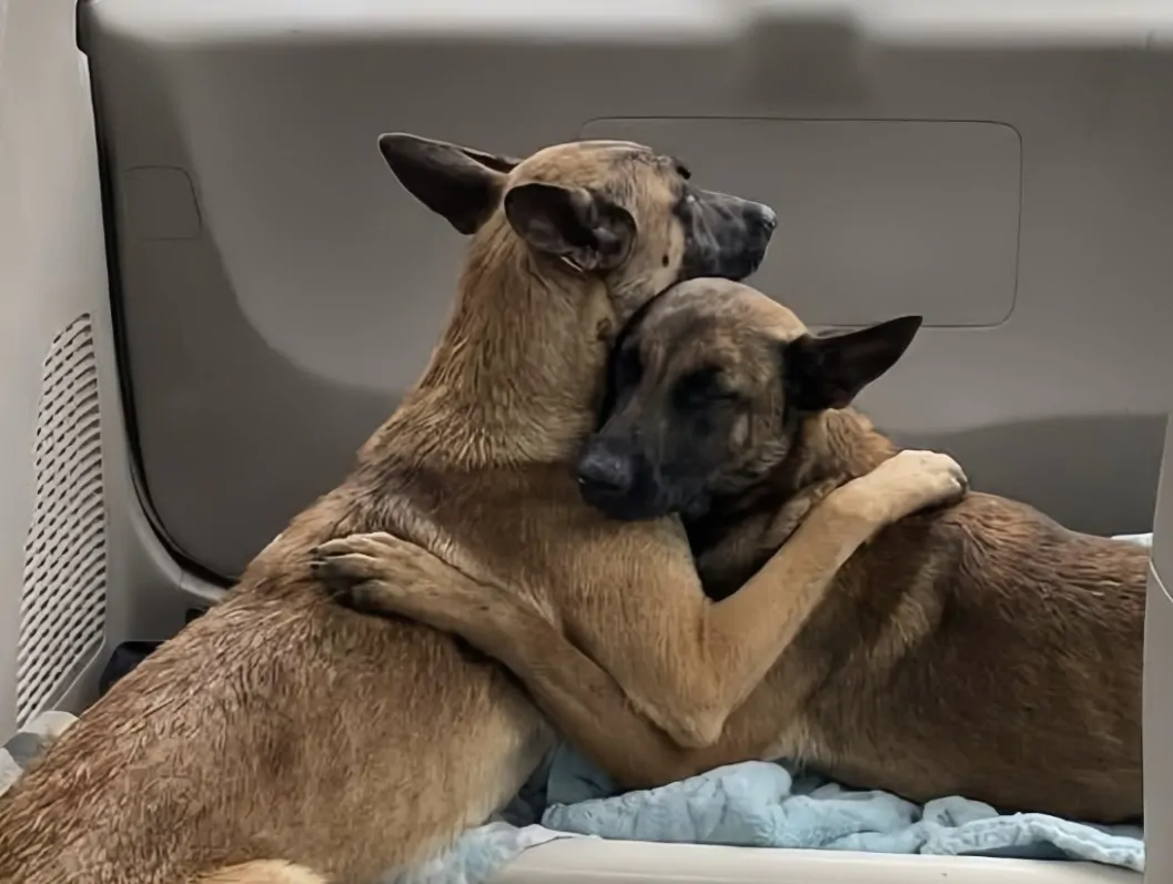 Quando i soccorritori hanno raggiunto il fossato, la scena apparsa davanti ai loro occhi ha subito chiarito la gravità della situazione. Non c’era un solo cane in difficoltà, ma due, accovacciati uno contro l’altro, ricoperti di fango e visibilmente provati. Uno dei due era allo stremo, incapace di reagire, con le forze ormai ridotte al minimo. Il secondo, pur provato, gli era rimasto incollato accanto, con il mento appoggiato sul suo collo, in una posizione che lasciava intuire un legame profondo. Anche al momento dell’intervento, quando le mani dei soccorritori si sono avvicinate, non ha mostrato alcuna intenzione di allontanarsi dal compagno.