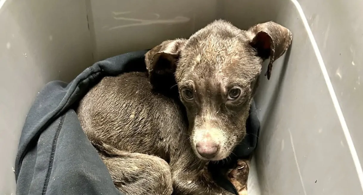 Un cucciolo trovato immobilizzato in una pozza di catrame viene salvato dopo un lungo intervento. Liberato, curato e adottato, oggi vive una nuova vita.