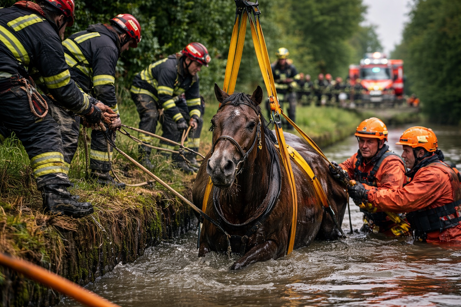 Un cavallo è scivolato in un canale agricolo ed è rimasto intrappolato per ore, prima di essere recuperato con un intervento complesso dei soccorritori.