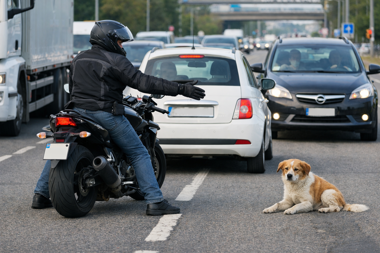 La scena si è svolta lungo una strada a scorrimento veloce di una regione del Sud, in Puglia, in un momento di traffico regolare. Un cane di taglia media, visibilmente disorientato, si è ritrovato improvvisamente al centro della carreggiata, incapace di capire da dove arrivasse il pericolo. Le auto procedevano in entrambe le direzioni e ogni tentativo dell’animale di muoversi finiva per riportarlo nello stesso punto, paralizzato dal rumore dei motori. In quel frangente, un motociclista, Marco, ha rallentato fino a fermarsi, comprendendo immediatamente il rischio. Senza segnali o richieste, ha posizionato la moto di traverso rispetto alla corsia, creando una barriera fisica che ha costretto le auto a fermarsi. La manovra è avvenuta in pochi secondi, sufficienti però a evitare un impatto che sarebbe potuto essere fatale. Alcuni automobilisti hanno inizialmente suonato il clacson, ignari di quanto stesse accadendo poco più avanti.