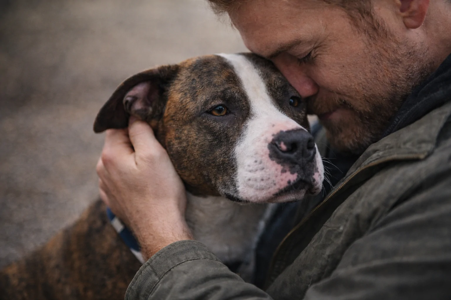 La terza sera è accaduto qualcosa di diverso. Il pitbull si è avvicinato lentamente. Nessuno si è mosso. Ha annusato la coperta, poi si è accoccolato accanto all’uomo. Il contatto è stato leggero, quasi esitante. Poi, senza rumore, ha fatto un gesto che nessuno si aspettava. Ha appoggiato la testa su quella del marito, come fosse un cuscino. È rimasto così, immobile. Non tremava più. Non c’era paura, solo un abbandono fragile e profondissimo. Nessuno ha parlato. Nessuno ha pianto ad alta voce. Quel momento non aveva bisogno di commenti. Era la dimostrazione che la fiducia, anche quando sembra perduta, può rinascere se lasciata libera di arrivare da sola. Il cane non è guarito in una sera. Le ferite restano. Ma ha fatto una scelta. E in quella scelta c’era tutto: il passato, il dolore, e una possibilità nuova che, per la prima volta, non faceva più paura.