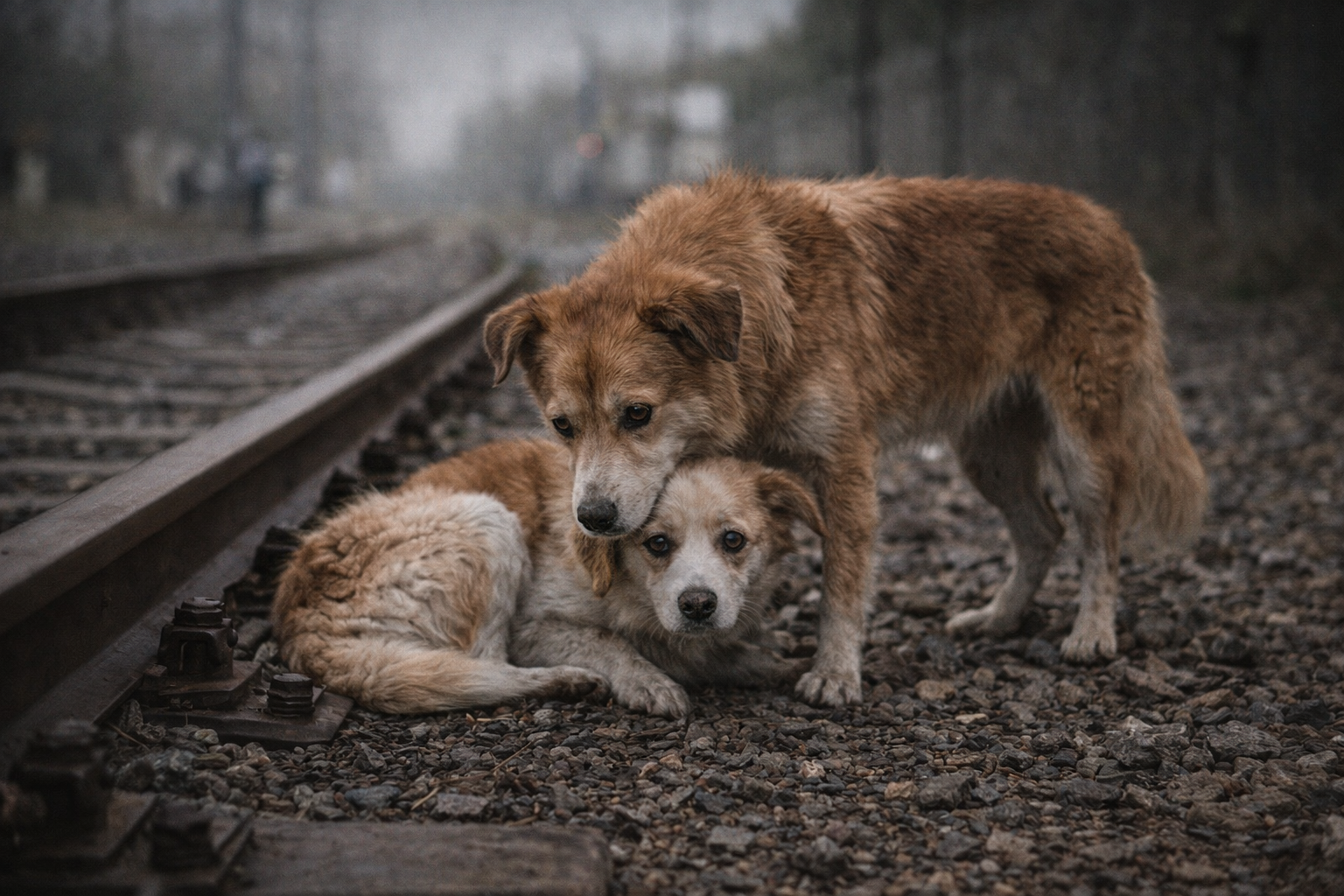 Due cani rimasti bloccati sui binari ferroviari per due giorni, uniti da affetto e istinto, mentre uno proteggeva l’altra dal pericolo dei treni.