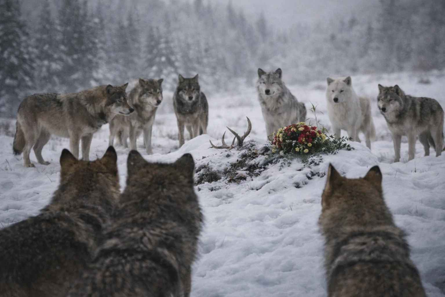 Un branco che si è raccolto attorno al corpo del proprio capo, riconoscendo la sua morte e vivendo un addio carico di significato.