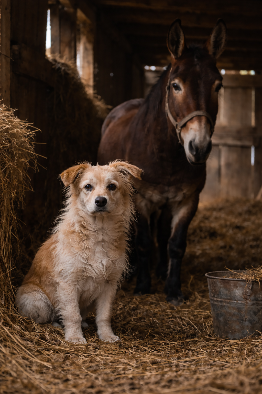 Quando è stata trovata, viveva in una stalla. Nessuna cuccia, nessun riparo vero. Solo terra battuta, odore di fieno vecchio e il respiro lento di un mulo come unica presenza costante. La cagna non aveva un nome. Nessuno la chiamava, nessuno la cercava. Condivideva quello spazio da tempo indefinito, adattandosi a una convivenza fatta di silenzi e abitudini ripetute. Il mulo rappresentava l’unico punto fermo della sua giornata. Nessun gioco, nessuna carezza, nessuna passeggiata. La sua vita era confinata lì, tra caldo soffocante d’estate e freddo umido d’inverno. Gli animali che vivono in isolamento sviluppano un equilibrio fragile, costruito sulla sopravvivenza più che sulla relazione. Lei si muoveva lentamente, osservava da lontano, manteneva le distanze. Non per aggressività, ma per mancanza di alternative.