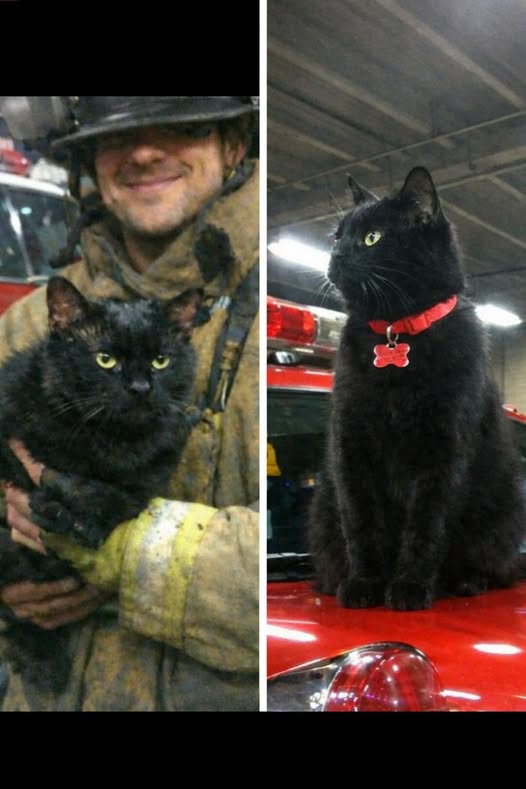Un incendio distrugge un deposito di pneumatici. Tra fumo e macerie, un vigile del fuoco salva un gatto nero ustionato che oggi vive in caserma ed è diventato parte della squadra.