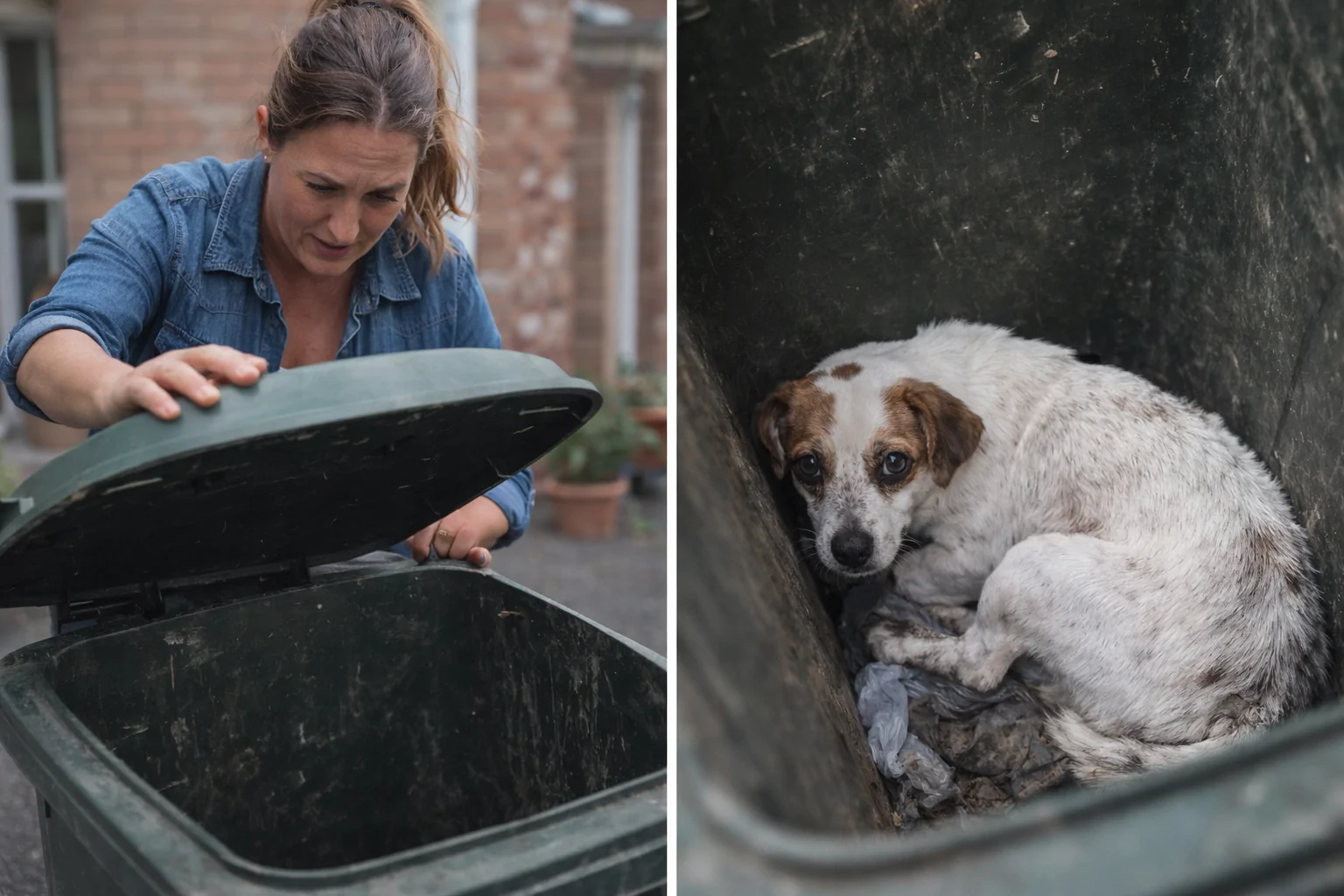 Le immagini registrate da una telecamera di sicurezza mostrano una scena che avrebbe potuto passare inosservata. Una donna rientra a casa, si ferma per un istante e nota un lieve movimento provenire da un bidone della spazzatura. In un primo momento pensa a un animale comune, forse un topo, attirato dai rifiuti. Il sospetto la porta ad avvicinarsi con cautela. Solleva il coperchio e guarda all’interno. Quello che vede la lascia senza parole. Nel bidone non c’è un roditore, ma una cagnolina, rannicchiata, immobile, ancora viva. L’animale appare spaesato, probabilmente abbandonato lì poco prima. La scena si svolge in una zona residenziale di una regione europea, in un contesto ordinario trasformato all’improvviso in qualcosa di drammatico.