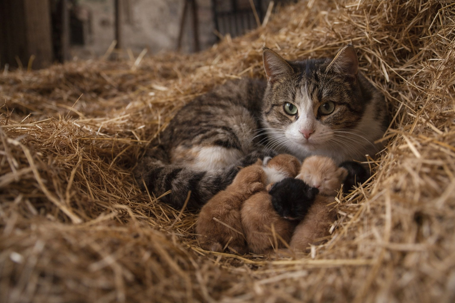 La scoperta è avvenuta nelle prime ore del mattino, in fondo a una stalla isolata, in una zona rurale di una regione italiana. Tra la paglia ancora tiepida, una gatta aveva scelto di mettere al mondo i suoi piccoli lontano dal rumore e dagli sguardi. Un luogo nascosto, protetto, individuato con attenzione. La madre era lì, distesa ma vigile, il corpo posizionato in modo da fare da barriera naturale ai cuccioli appena nati. Nei suoi occhi non c’era agitazione, solo concentrazione e protezione. Chi li ha scoperti ha raccontato: “Mi sono avvicinato piano, quasi trattenendo il respiro”. La gatta non si è mossa, non ha soffiato, non ha tentato la fuga. È rimasta ferma, come se avesse compreso che quella presenza non rappresentava un pericolo immediato per i piccoli.