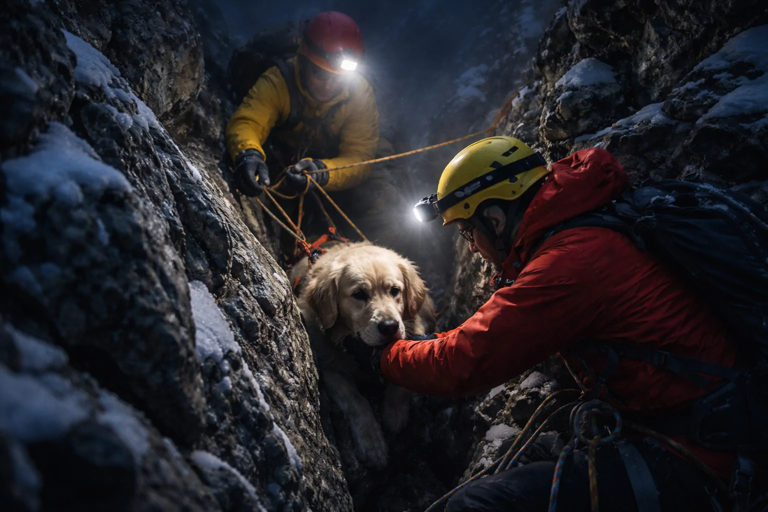 Sono stati predisposti gli ancoraggi sulla neve e sulle rocce, montate le soste e preparate le funi. La discesa è avvenuta con estrema cautela. Sotto, solo buio e pareti verticali. Avvicinandosi all’animale, la guida ha percepito la sua tensione: il cane tremava, osservava ogni movimento, valutando chi aveva davanti. Dopo un lungo istante di esitazione, Orco ha scelto di fidarsi. Non ha reagito, non ha mostrato segni di aggressività. È stato imbragato con attenzione, mentre Nicola, dall’alto, gestiva le manovre di sicurezza.