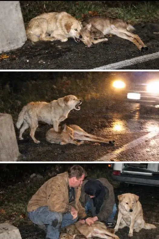 Andando al lavoro, un uomo ha notato il cane che non si spostava dal bordo della carreggiata. Avvicinandosi, ha visto il cervo ferito e il cane disteso accanto a lui. La scena lo ha colpito profondamente. Il cane aveva appoggiato la testa sul collo del cervo, in un gesto che sembrava protezione o conforto.