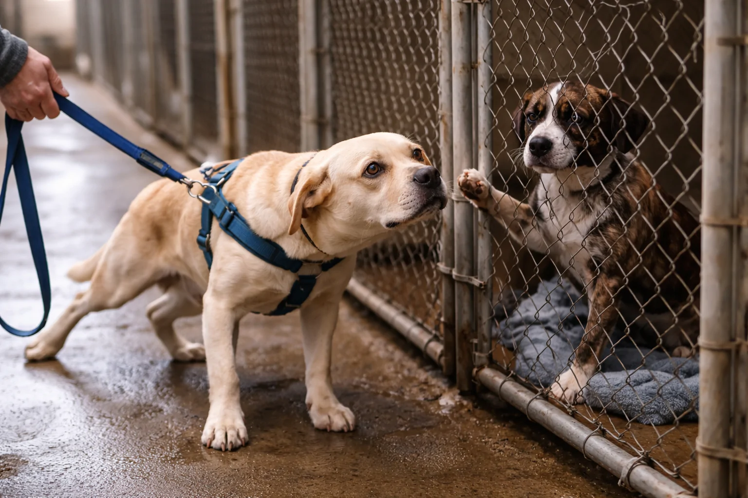 Una storia di animali racconta un legame nato in un rifugio, dove un cane adulto si blocca al momento dell’adozione per non separarsi dal suo compagno più fragile, cambiando il destino di entrambi.