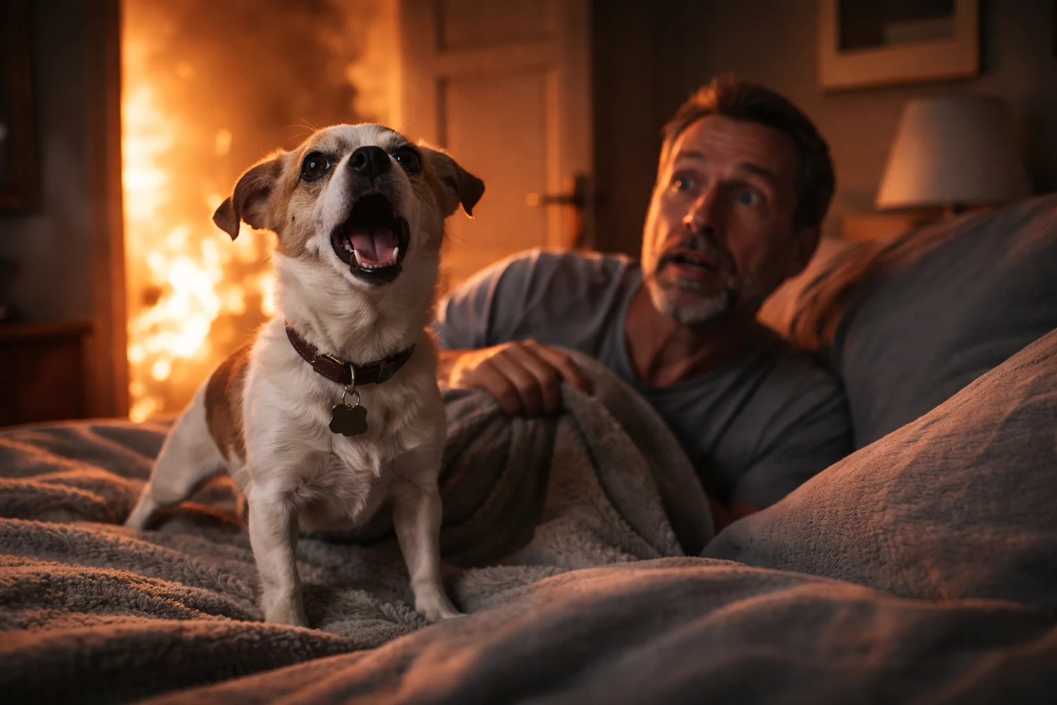 In quel momento, il cane ha compiuto un gesto mai visto prima. È saltato sul petto del proprietario con forza e decisione. Non per gioco. Non per cercare attenzioni. Il comportamento era diverso dal solito, insistente, urgente. Il cane abbaiava, tirava la maglietta, si muoveva nervosamente tra il letto e la porta, arrivando persino a bloccare il passaggio.