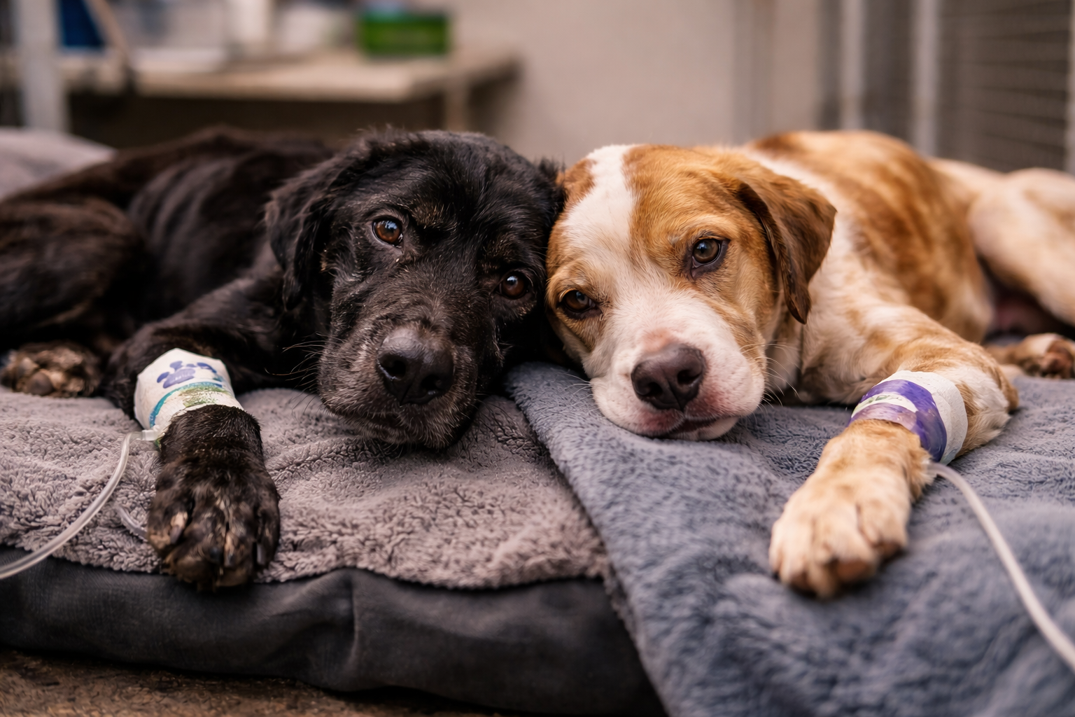 Salvataggio animali dopo una scena drammatica: due cani trovati a terra, gravemente feriti, vengono soccorsi in extremis e oggi sono seguiti quotidianamente dopo un intervento decisivo.