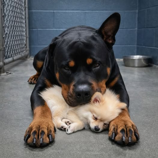 In un angolo della casa giaceva Titan, un Rottweiler di quasi cinquanta chili, segnato da cicatrici evidenti e privo di un orecchio. Il cane era estremamente debilitato, troppo debole per alzarsi. Tra le sue zampe anteriori, stretta contro il suo corpo, c’era Luna, una Pomerania minuscola di appena due chili, sorda e quasi cieca, con quattordici anni di vita.