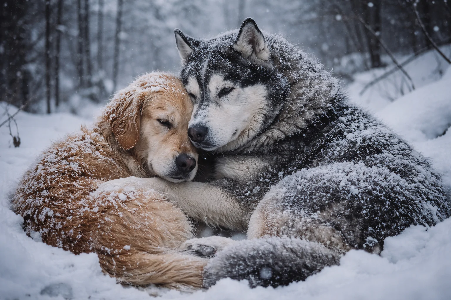 Due cuccioli trovati all’alba nel gelo, stretti per sopravvivere. Salvati e curati, oggi vivono insieme, inseparabili, simbolo di resistenza e fiducia ritrovata.