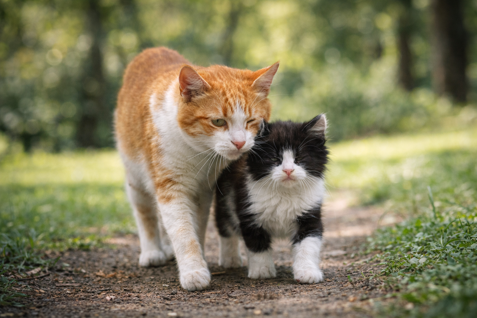 Nel tempo, quella che era iniziata come una presenza occasionale è diventata una scena abituale del parco: un gatto tigrato che procede lentamente, seguito passo dopo passo da un piccolo bianco che si orienta grazie alla sua guida.