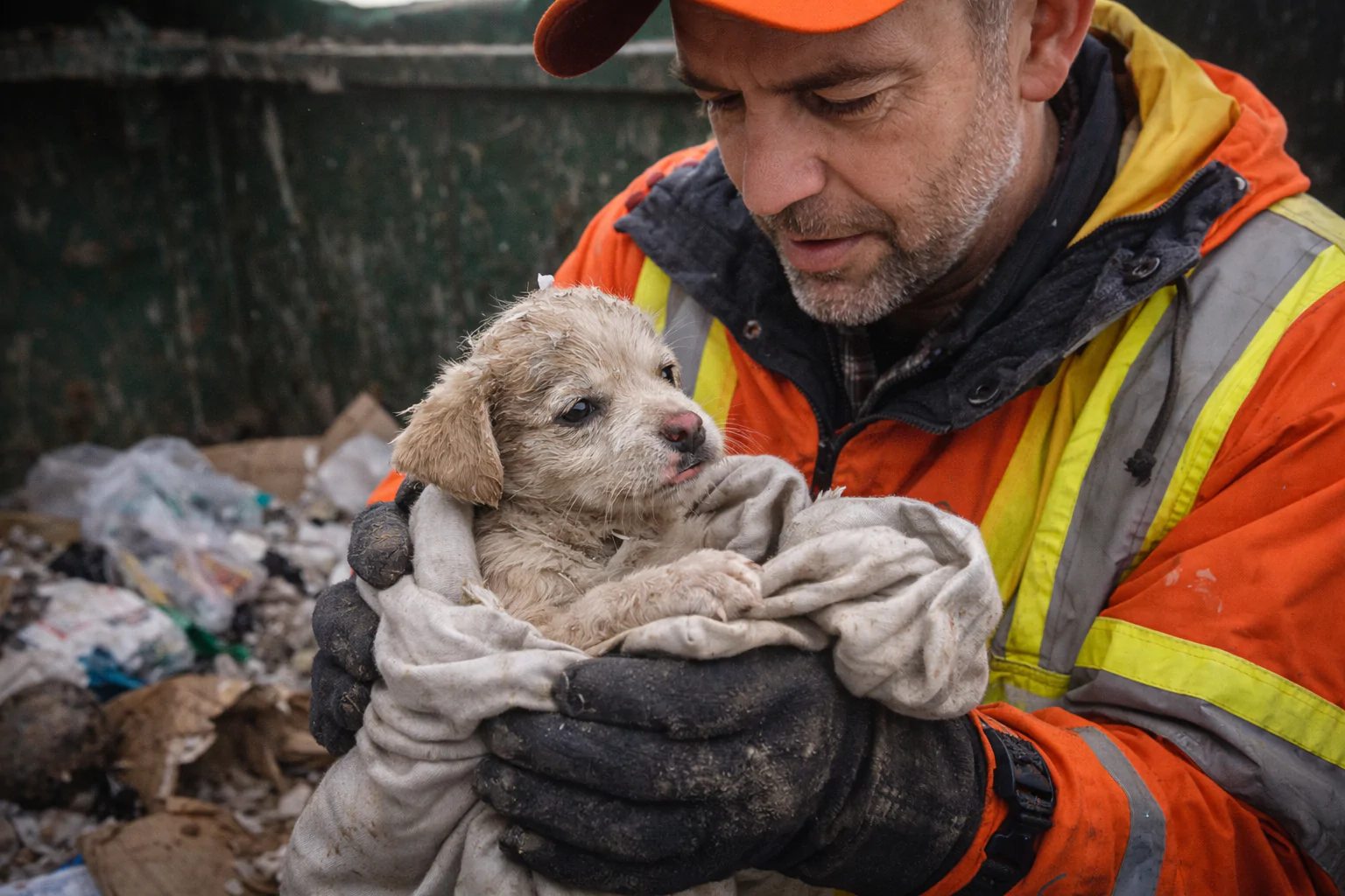 Un operatore ecologico sente un lamento in un container e salva un cucciolo abbandonato, trovato in condizioni critiche ma ancora vivo.