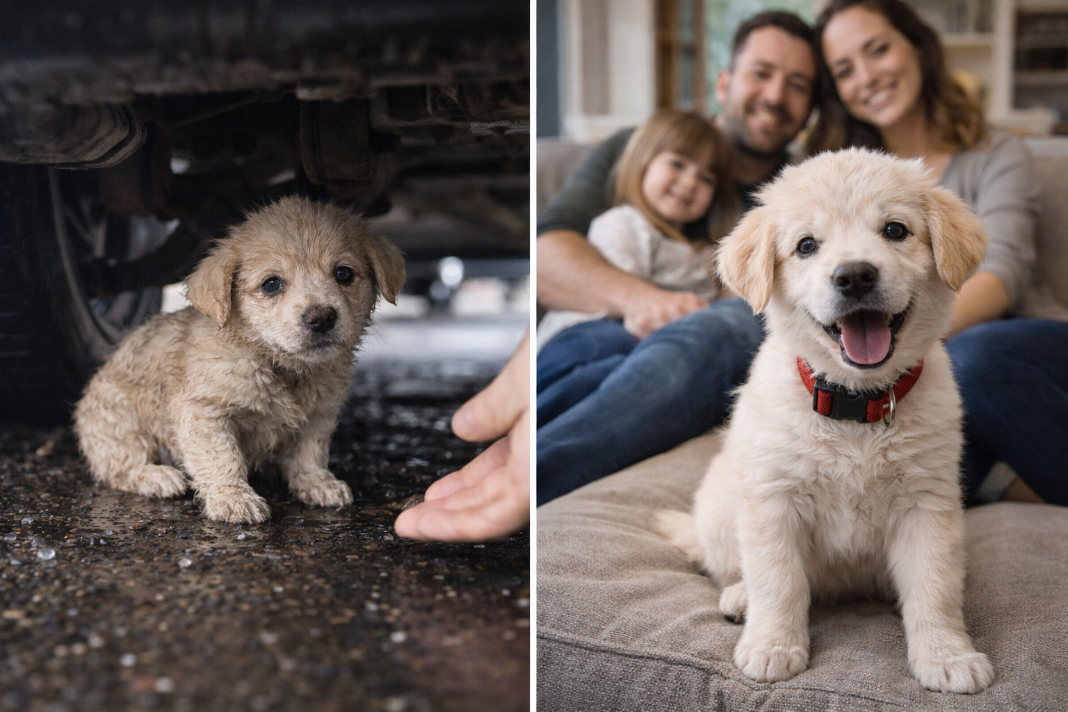 Un cucciolo tremante viene trovato sotto un’auto. Soccorso e adottato, oggi vive al sicuro e ha una famiglia.