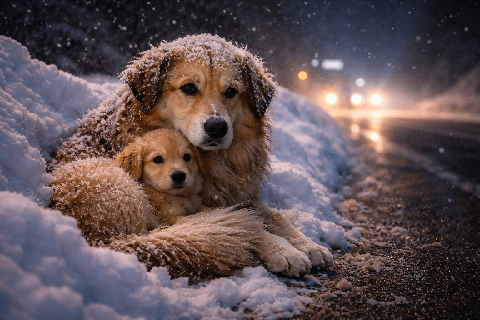 In mezzo a quel paesaggio ostile, un cane era fermo sul ciglio della carreggiata. Non si muoveva. Le auto passavano veloci accanto a lui, i fari illuminavano per pochi secondi la sua figura, poi tornava l’oscurità.