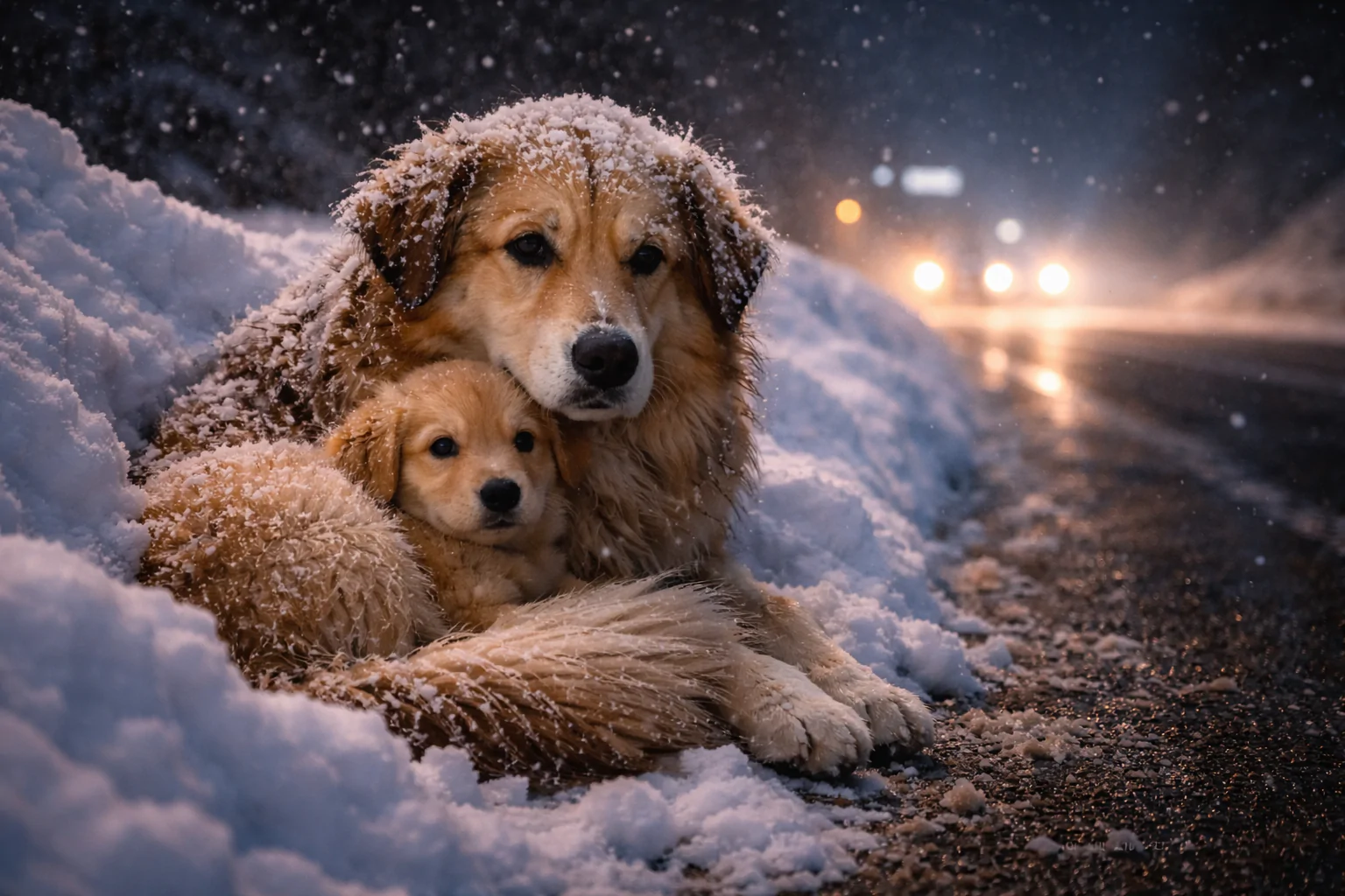 Un cane resta immobile per ore nella neve della regione Manitoba, proteggendo un cucciolo dal gelo e permettendogli di sopravvivere fino ai soccorsi.