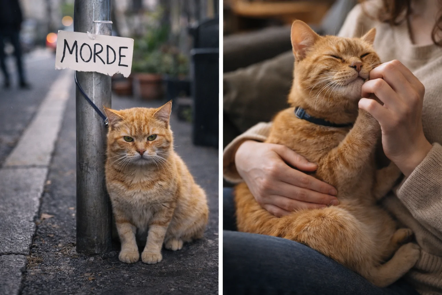 Tre anni fa, lungo una strada della regione Piemonte, una scena insolita ha attirato l’attenzione di chi passava. Un gatto era legato a un palo, fermo e immobile. Appeso al collo aveva un cartello scritto a mano con un pennarello nero: “MORDE”.