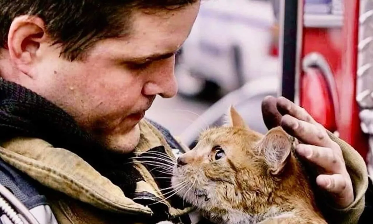 Estratto da un incendio con il pelo impregnato di fumo e il corpo tremante, un gatto si calma solo quando incrocia lo sguardo del vigile del fuoco che lo ha salvato.