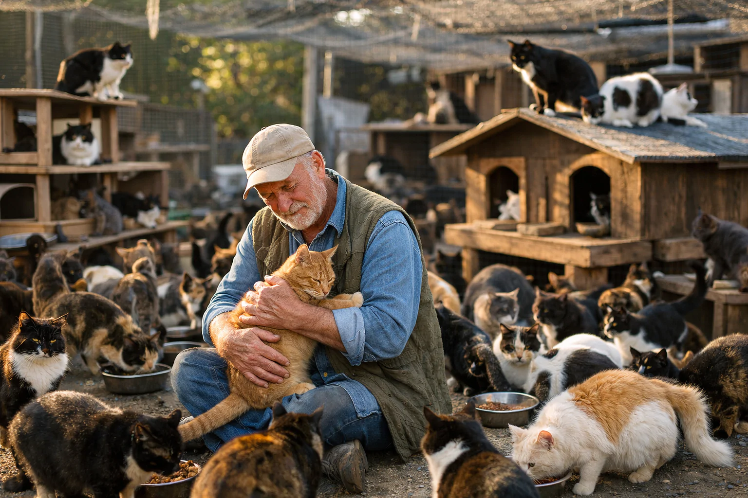Un ex insegnante salva 1.200 gatti randagi, finanzia rifugi e cure con i libri che scrive, creando un villaggio sicuro per animali fragili e malati.