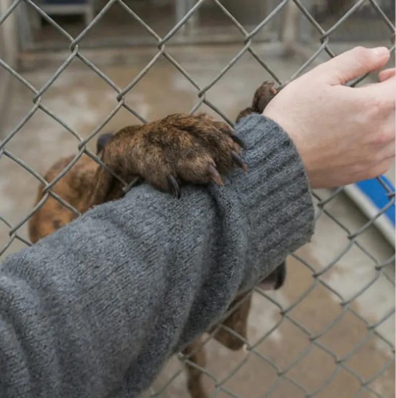 Non era un gesto aggressivo. La presa era ferma, ma delicata. Quando il braccio si è avvicinato alla rete, Otis ha appoggiato la guancia sulla mano, emettendo un lamento basso e continuo.