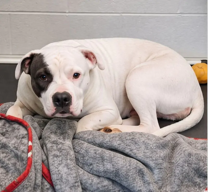 Bella, Boxer bianca di 5 anni, viene riportata al rifugio perché cercava il contatto notturno con la sua famiglia. Ora attende una nuova adozione stabile.
