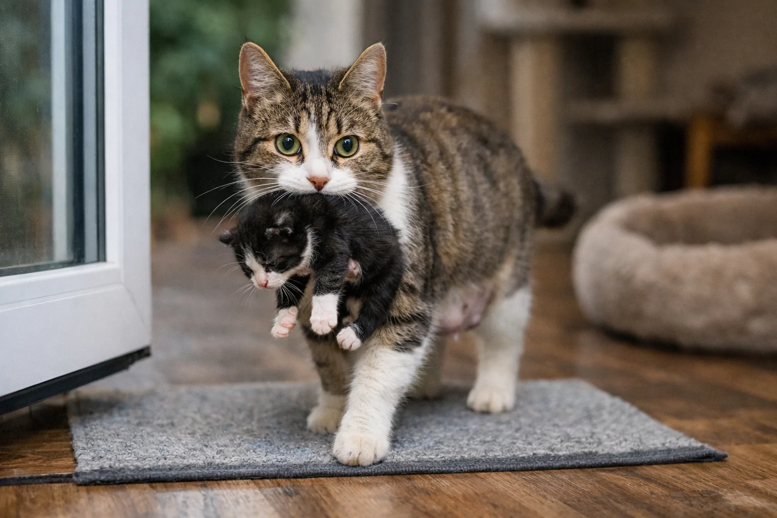La gatta ha attraversato la stanza senza esitazione e ha deposto il piccolo ai piedi della proprietaria. Poi si è fermata, mantenendo il contatto visivo.