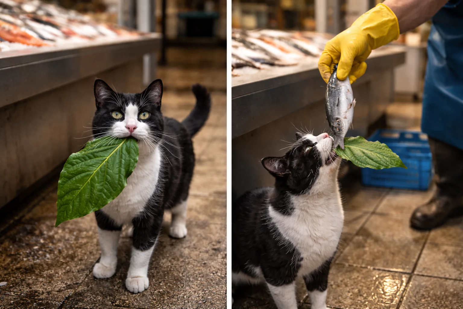 Una gatta entra ogni giorno in pescheria con una foglia. La posa sul banco e aspetta. Il negoziante accetta lo scambio e il gesto diventa un rituale.