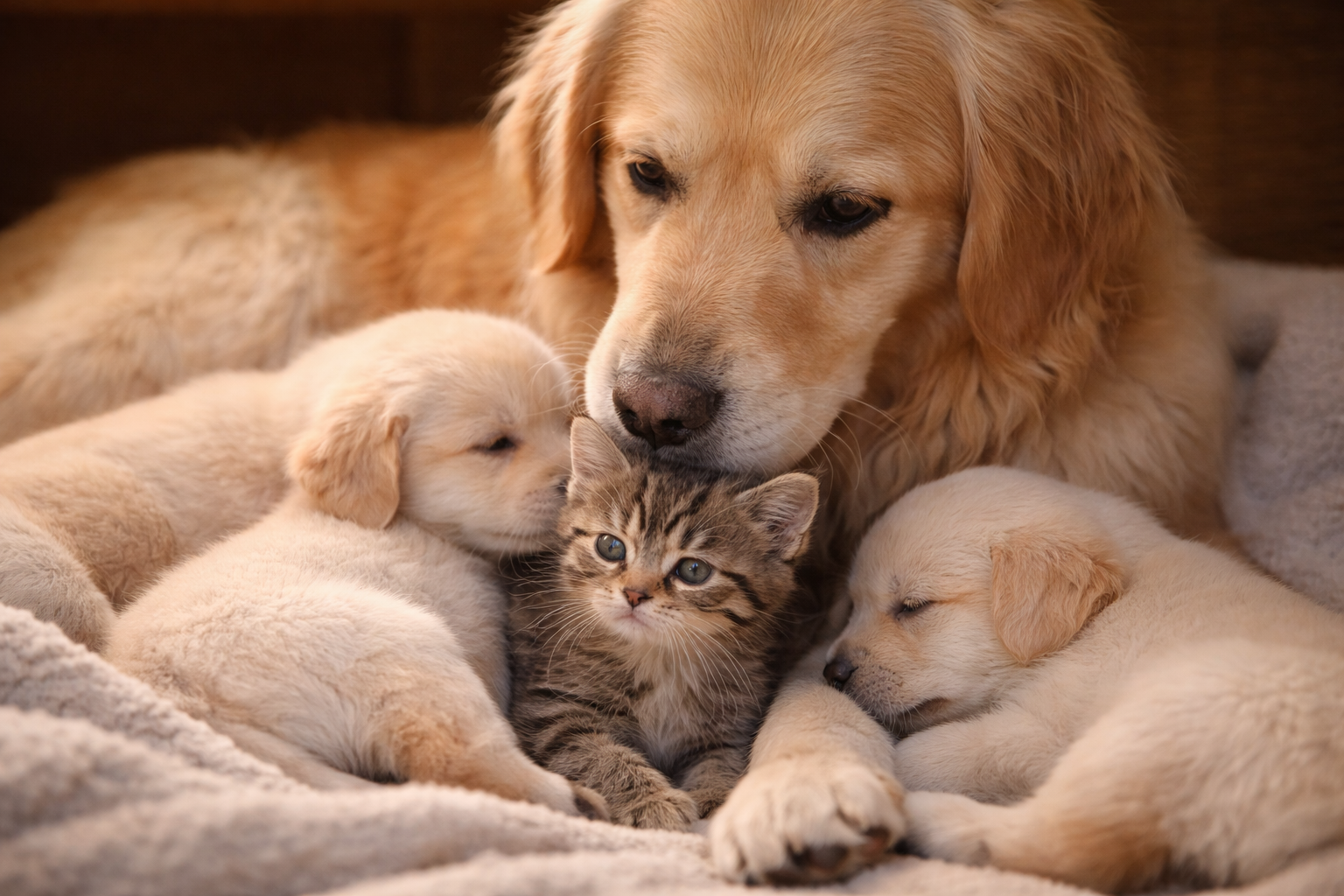 Mentre si cercava una soluzione, la cagna si è alzata dal suo giaciglio. Si è avvicinata lentamente al gattino, lo ha annusato e poi leccato più volte. Senza mostrare esitazioni, lo ha preso delicatamente tra i denti e lo ha trasportato nel nido dove si trovavano i suoi cuccioli.