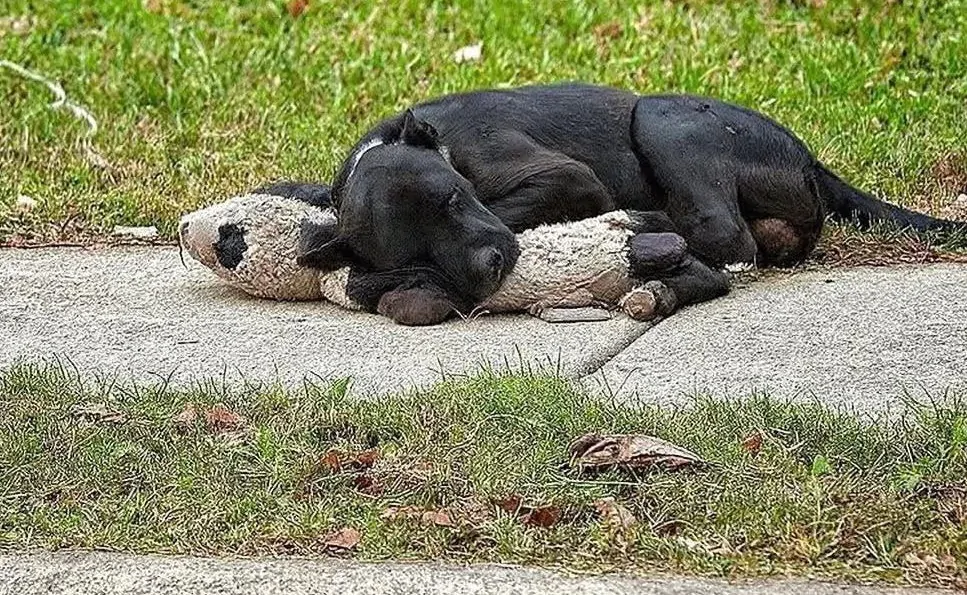 Quando lo trovarono, il cane era sdraiato nello stesso punto di sempre, con il coniglietto di peluche sotto la testa, come se stesse aspettando che il suo piccolo compagno tornasse a prenderlo per giocare ancora.