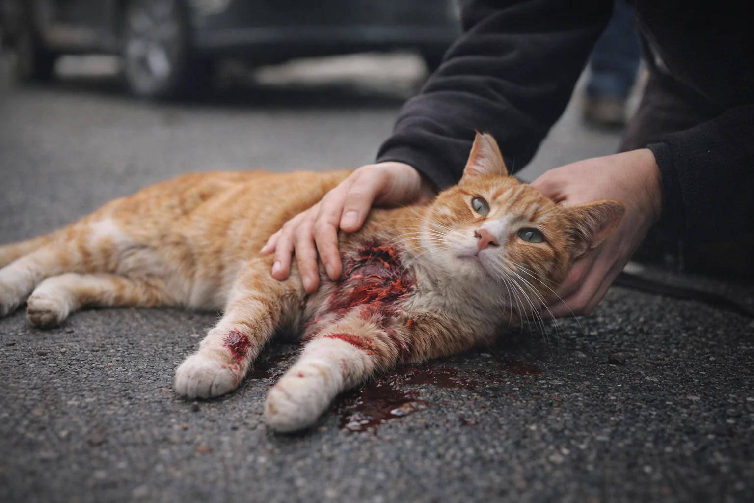 Una volta sceso dall’auto, la situazione è apparsa immediatamente chiara e grave. A terra c’era un gatto sdraiato su un fianco, immobile, con il respiro affannoso e una zampa posteriore in una posizione innaturale.