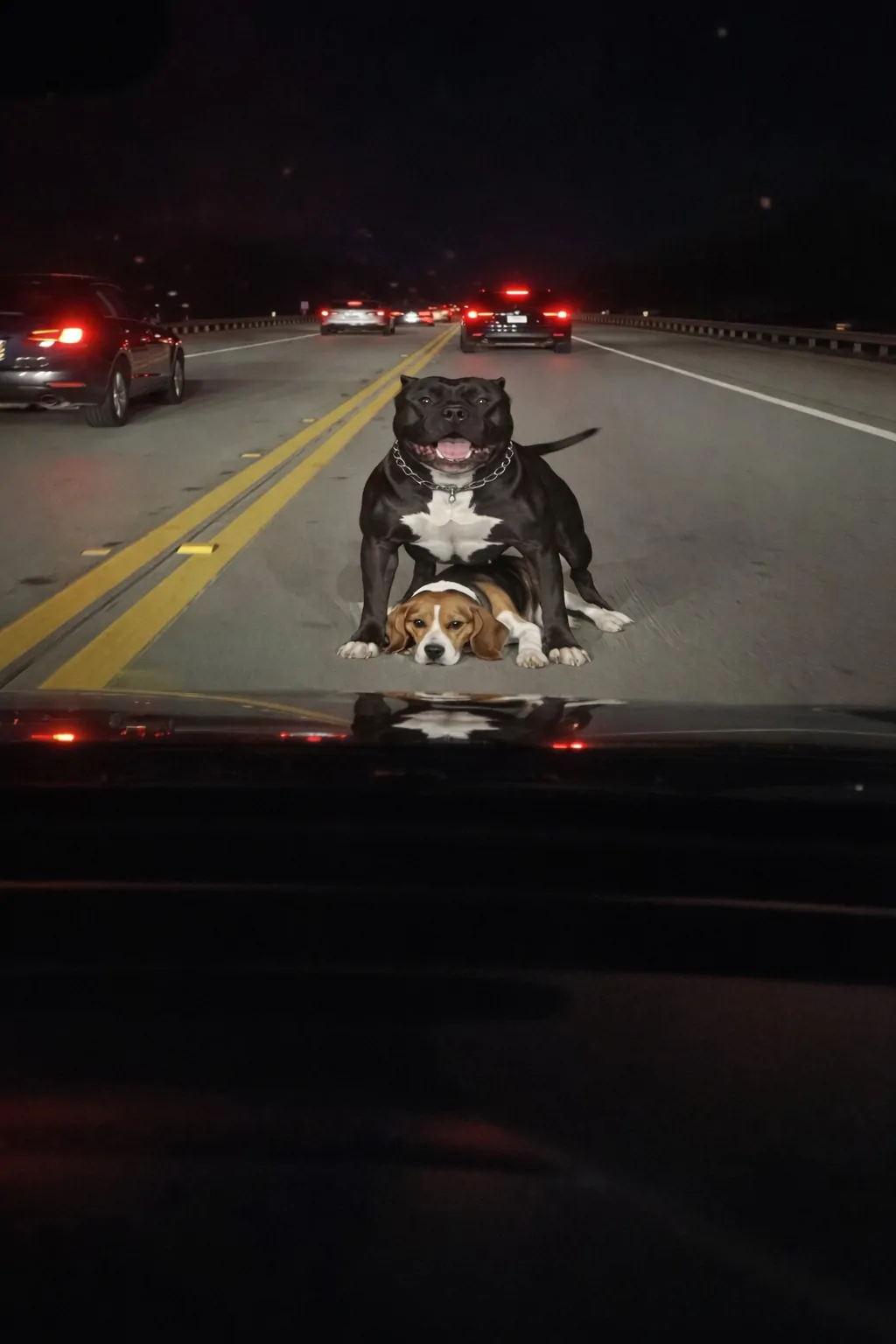 Un pitbull ferma le auto su un’interstatale per proteggere una Beagle con la zampa rotta appena lanciata da un veicolo; entrambi vengono poi adottati insieme.
