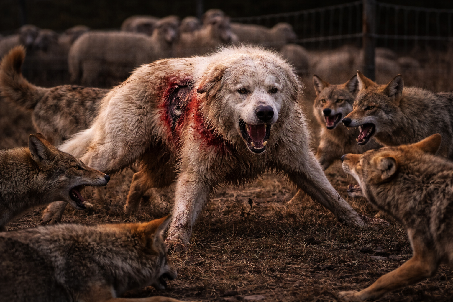 Il cane corse verso il gruppo di predatori prima ancora che raggiungessero le pecore. Il confronto iniziò nel buio, lontano dalla casa della fattoria, mentre il resto degli animali rimaneva protetto dietro il recinto.