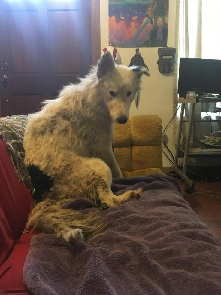 Quando è arrivato nella nuova casa, il cane non ha mostrato entusiasmo né curiosità. Si è seduto sul divano con il corpo curvo e lo sguardo perso, come se cercasse di diventare invisibile, mentre ogni movimento sembrava guidato dalla paura accumulata durante una vita fatta di abbandono, solitudine e probabilmente maltrattamenti.