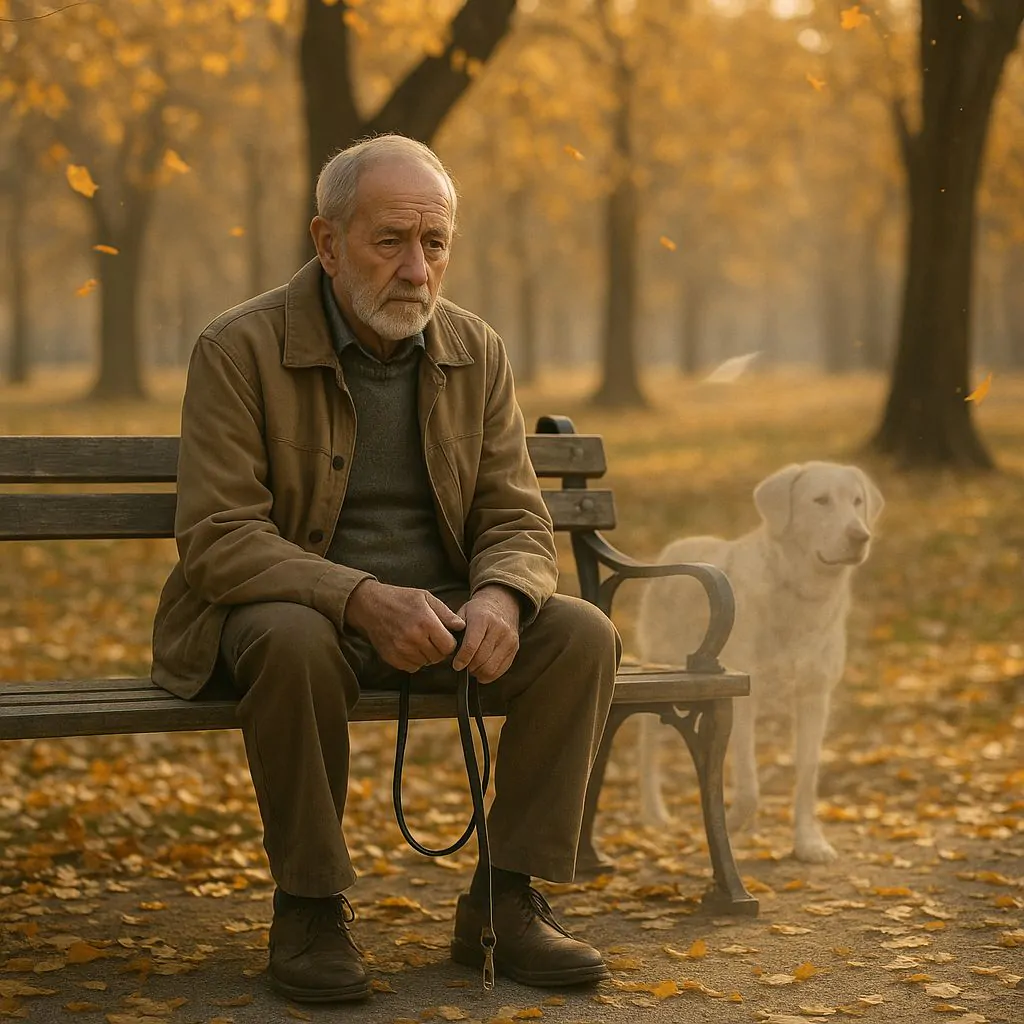 Chi osserva da fuori può vedere soltanto un uomo seduto su una panchina con un guinzaglio in mano, ma non vede ciò che esiste dall’altra parte: un legame che continua a esistere nella memoria e nel cuore.